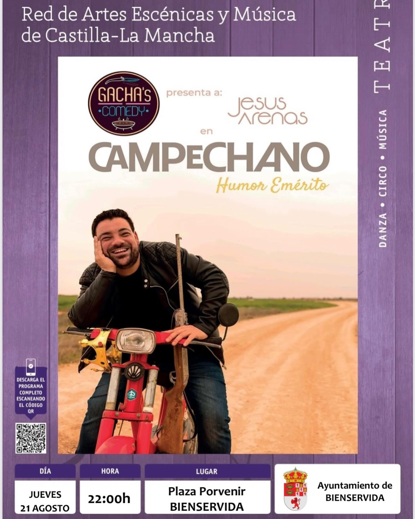 El próximo jueves 21 de agosto, a las 22:00 h, la Plaza Porvenir de Bienservida será el escenario de una noche cargada de humor manchego con la actuación del cómico Jesús Arenas, que presenta su espectáculo “Campechano. Humor Emérito” dentro de la programación de la Red de Artes Escénicas y Música de Castilla-La Mancha.