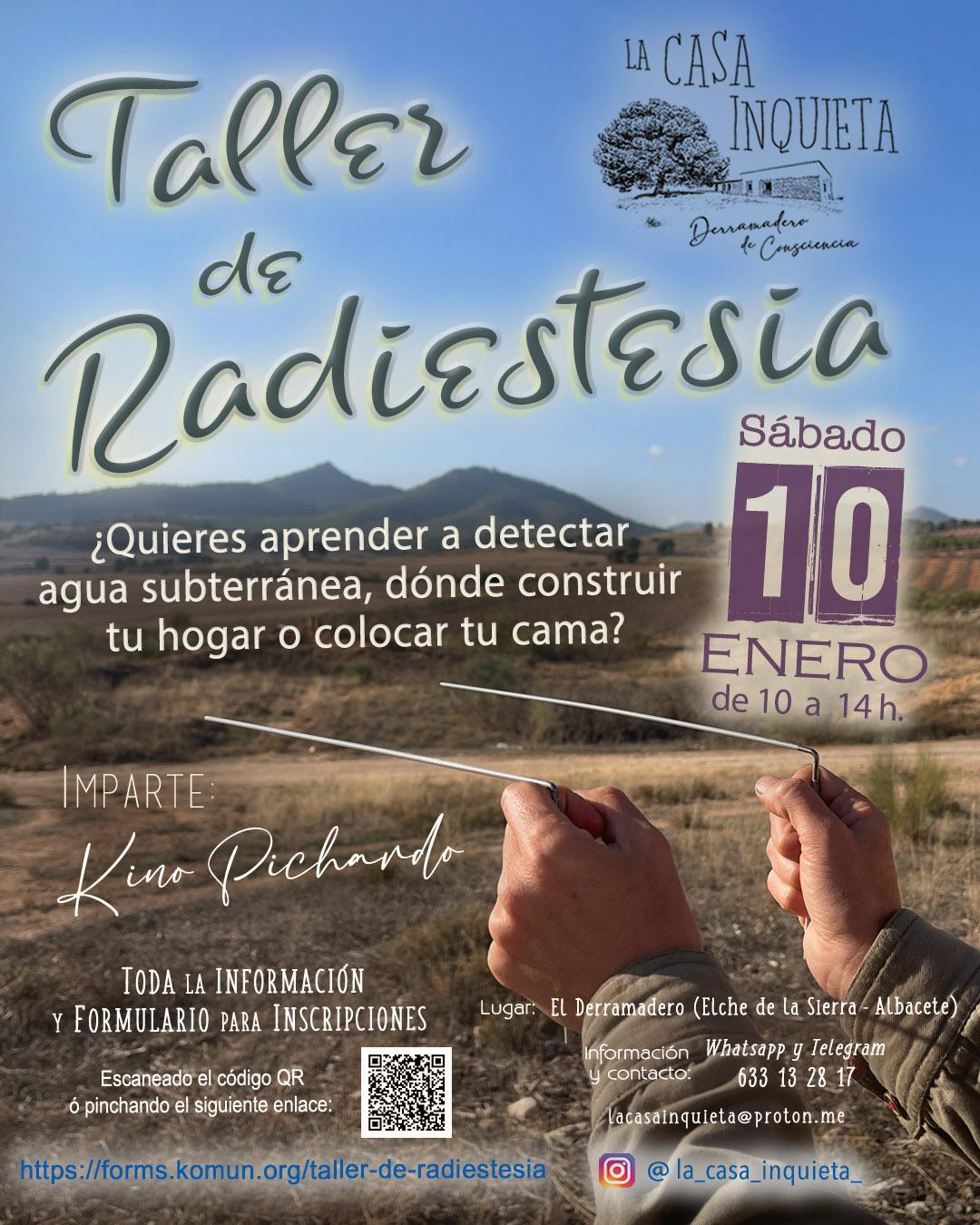 El taller estará impartido por Kino Pichardo y se centrará en el aprendizaje de técnicas de radiestesia aplicadas a la detección de agua subterránea, así como a la identificación de lugares adecuados para la construcción de viviendas o la correcta colocación de espacios de descanso, como la cama.