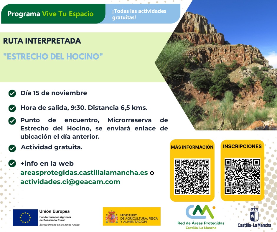 La ruta está abierta a todos los públicos y no requiere ningún pago, ya que se trata de una actividad gratuita incluida en la programación de otoño del Programa “Vive tu Espacio”, impulsado por la Junta de Comunidades de Castilla-La Mancha a través de la Red de Áreas Protegidas, con la colaboración del Ministerio de Agricultura, Pesca y Alimentación y la Unión Europea, a través del Fondo Europeo Agrícola de Desarrollo Rural (FEADER).