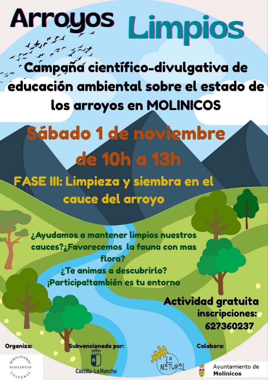 La tercera fase del proyecto “Arroyos Limpios”, celebrada el pasado sábado 1 de noviembre, reunió a numerosos vecinos y vecinas del municipio que se sumaron con entusiasmo a esta iniciativa de educación ambiental y recuperación de cauces impulsada por la entidad Resilencio, con la colaboración del Ayuntamiento de Molinicos y el apoyo de la Junta de Castilla-La Mancha.