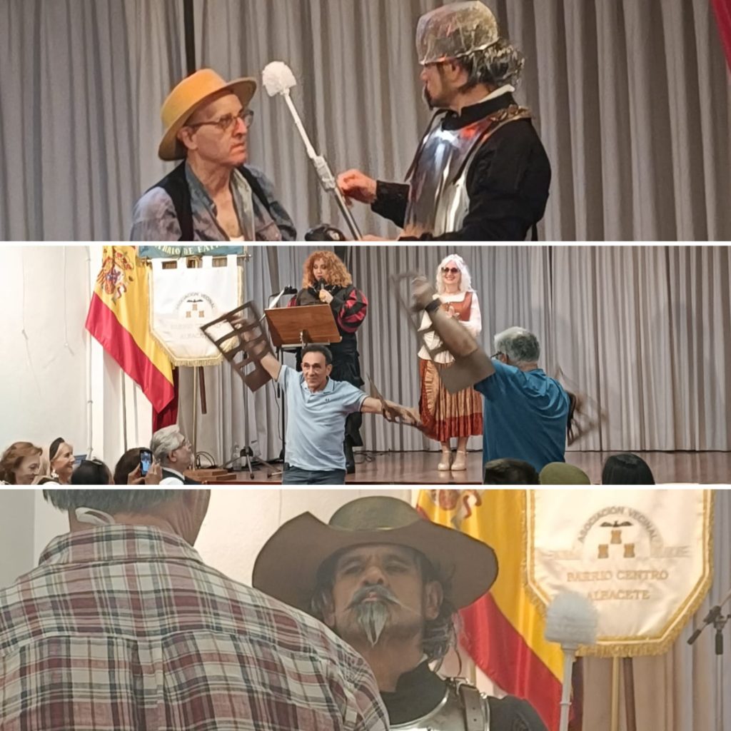Previamente al esperado desfile, se representó una breve y divertida adaptación de El ingenioso hidalgo Don Quijote de la Mancha. Y, así, salieron al escenario los famosos personajes: el caballero andante “ingeniosamente” pertrechado con una escobilla de váter a modo de lanza, Sancho con una improvisada panza y su rucio de goma, y un par de espectadores que batían planchas de cartón a modo de aspas de molinos (o gigantes).