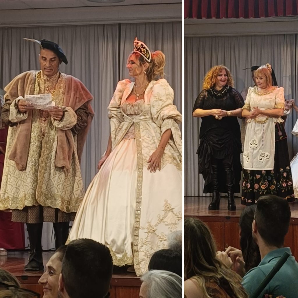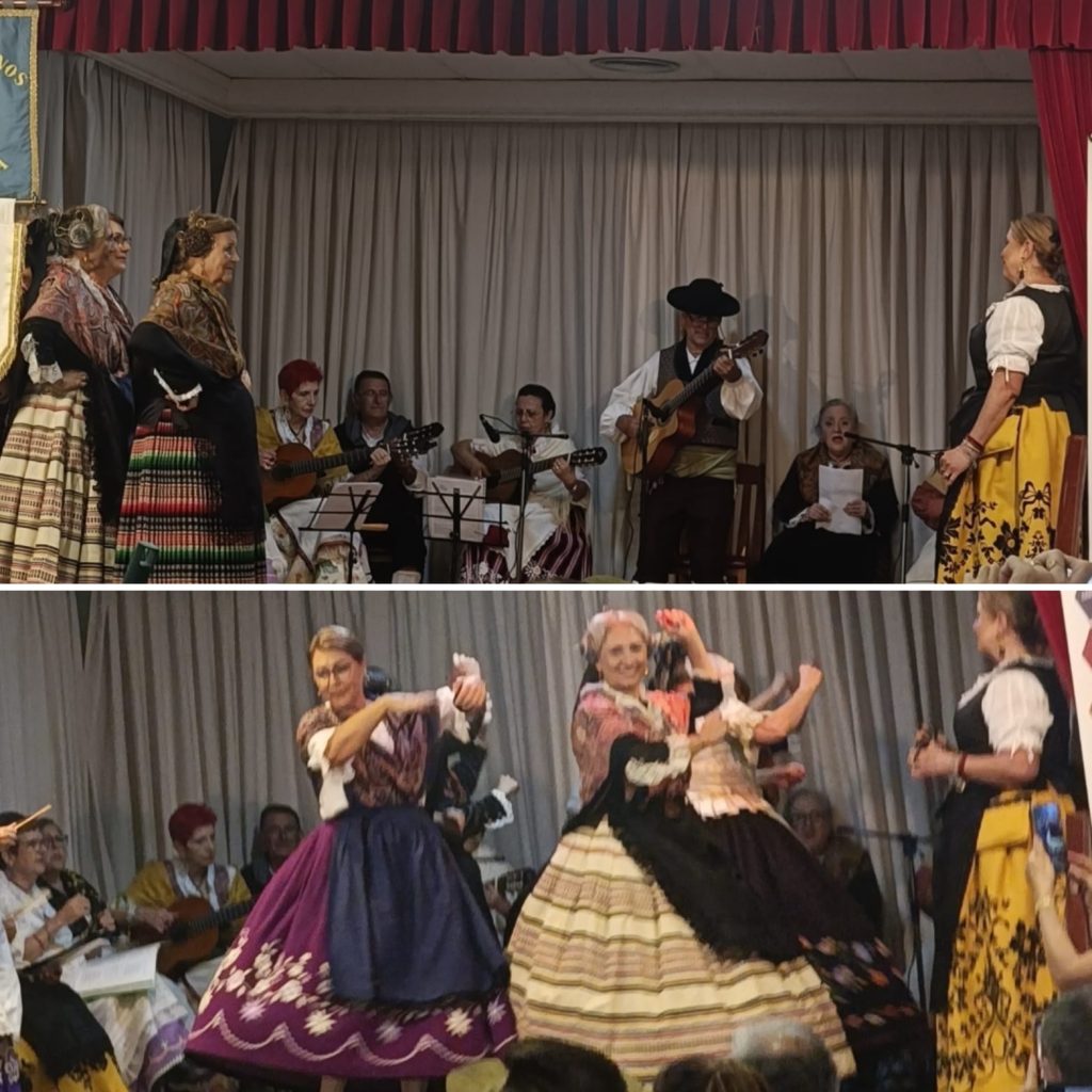 La cita comenzó con un ameno repertorio de jotas manchegas interpretado por la asociación vecinal Barrio Centro de Albacete y Barrio Fátima, presididas por Lorena Peralta. “Por dónde vas a misa, que no te veo / por un callejón que han hecho nuevo”, arrancaba la jota de Molinicos, gran representante de la sierra albaceteña. Con sus bellos trajes y recogidos, bailó el grupo en el escenario la Jota del aire de Alcalá de Júcar. Tocaron también la Jota del cordón de San Carlos del Valle y la de Villapalacios, la cual dedicaron a la vecina Adelina: “Se me torció la besana / labrando en el retamal / y al acordarme de ti / me se enderezó, serrana”.