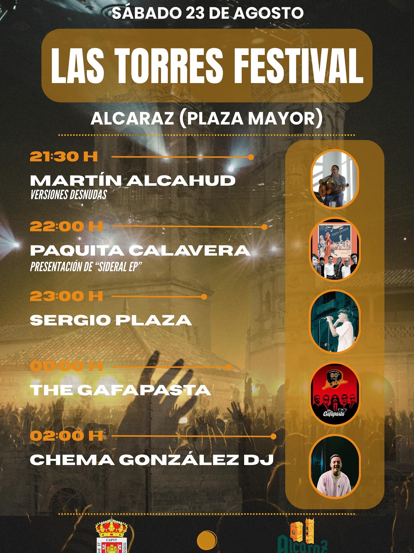 La Plaza Mayor de Alcaraz será el epicentro musical el próximo sábado 23 de agosto, con la puesta en escena de Las Torres Festival, una noche cargada de actuaciones variadas que encandilará a todos con su mezcla de talento local y propuestas emergentes.