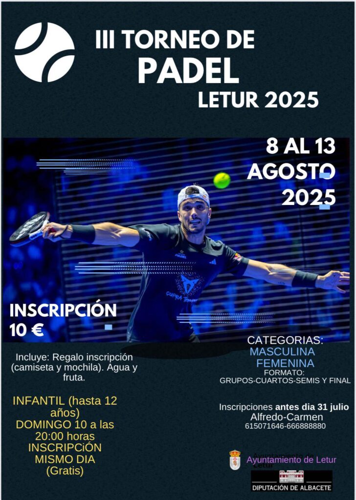 Además, del 8 al 13 de agosto se celebrará el III Torneo de Pádel Letur 2025, que incluye categorías masculina y femenina. La inscripción es de 10 euros e incluye camiseta, mochila, agua y fruta. También habrá torneo infantil gratuito el domingo 10 por la tarde.