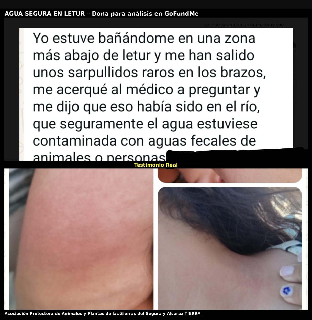 Una vecina ha denunciado haber sufrido “sarpullidos raros en los brazos” tras bañarse en una zona baja del río. Su médico, según su testimonio, vinculó el origen de la irritación al estado del agua, posiblemente contaminada. La imagen del caso y el mensaje han sido compartidos por la Asociación Protectora de Animales y Plantas de las Sierras del Segura y Alcaraz “Tierra”, que trabaja en coordinación con la plataforma ciudadana.