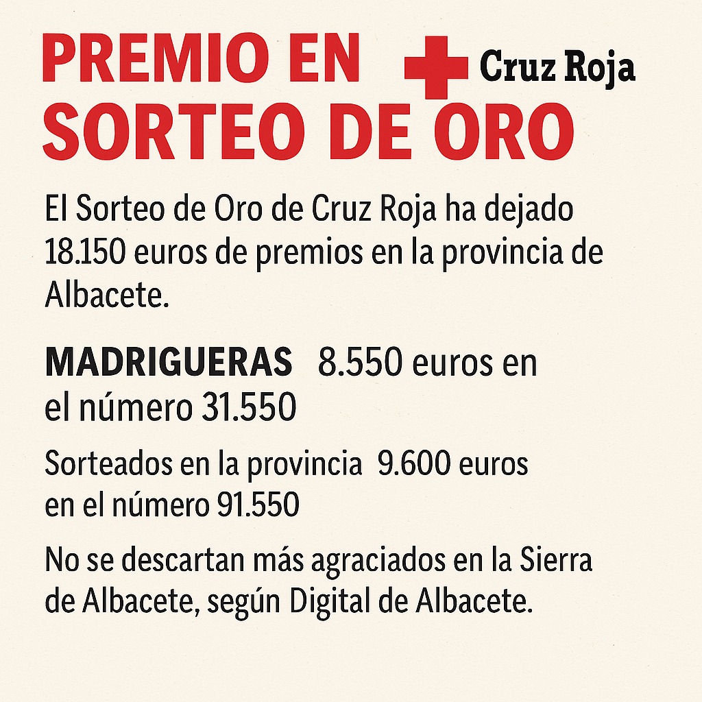 Según publica El Digital de Albacete, el Sorteo de Oro de Cruz Roja ha dejado este año un pellizco de suerte en la provincia, con 18.150 euros repartidos entre varios…