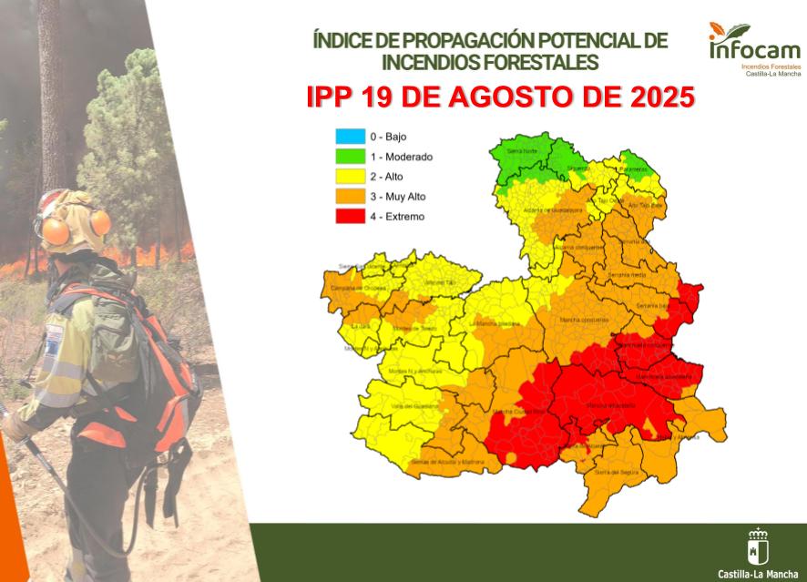 La jornada de hoy, martes 19 de agosto, arranca de nuevo bajo la alerta máxima por incendios forestales en buena parte de Castilla-La Mancha, y de manera muy especial en la Sierra de Albacete, donde el nivel de propagación potencial alcanza la categoría 4 – Extremo, según ha informado el dispositivo INFOCAM.