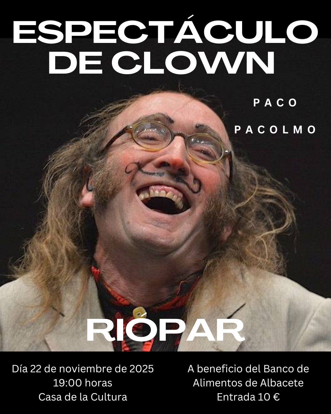 La Casa de la Cultura de Riópar acogerá el sábado 22 de noviembre, a las 19:00 horas, el espectáculo de clown y magia “Paco Pacolmo”, una propuesta pensada para todos los públicos —aunque especialmente dirigida al público adulto— que promete una tarde repleta de humor, imaginación y sorpresas.