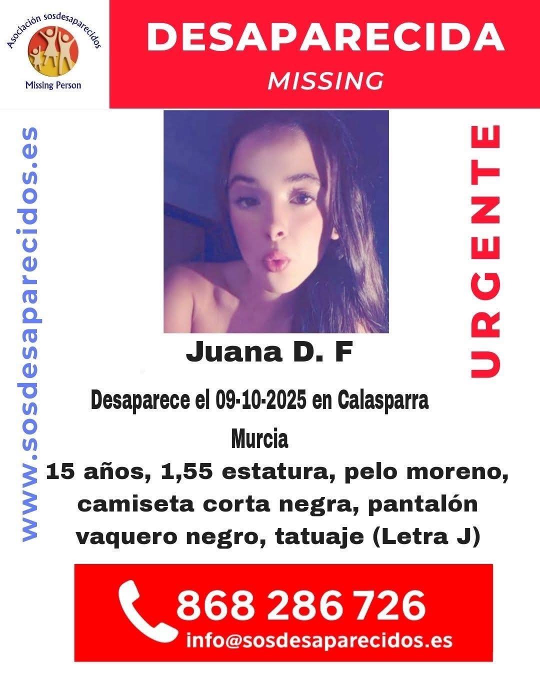 La asociación SOS Desaparecidos ha emitido una alerta para encontrar a Juana D. F., una joven de 15 años desaparecida el 9 de octubre de 2025 en Calasparra (Murcia).