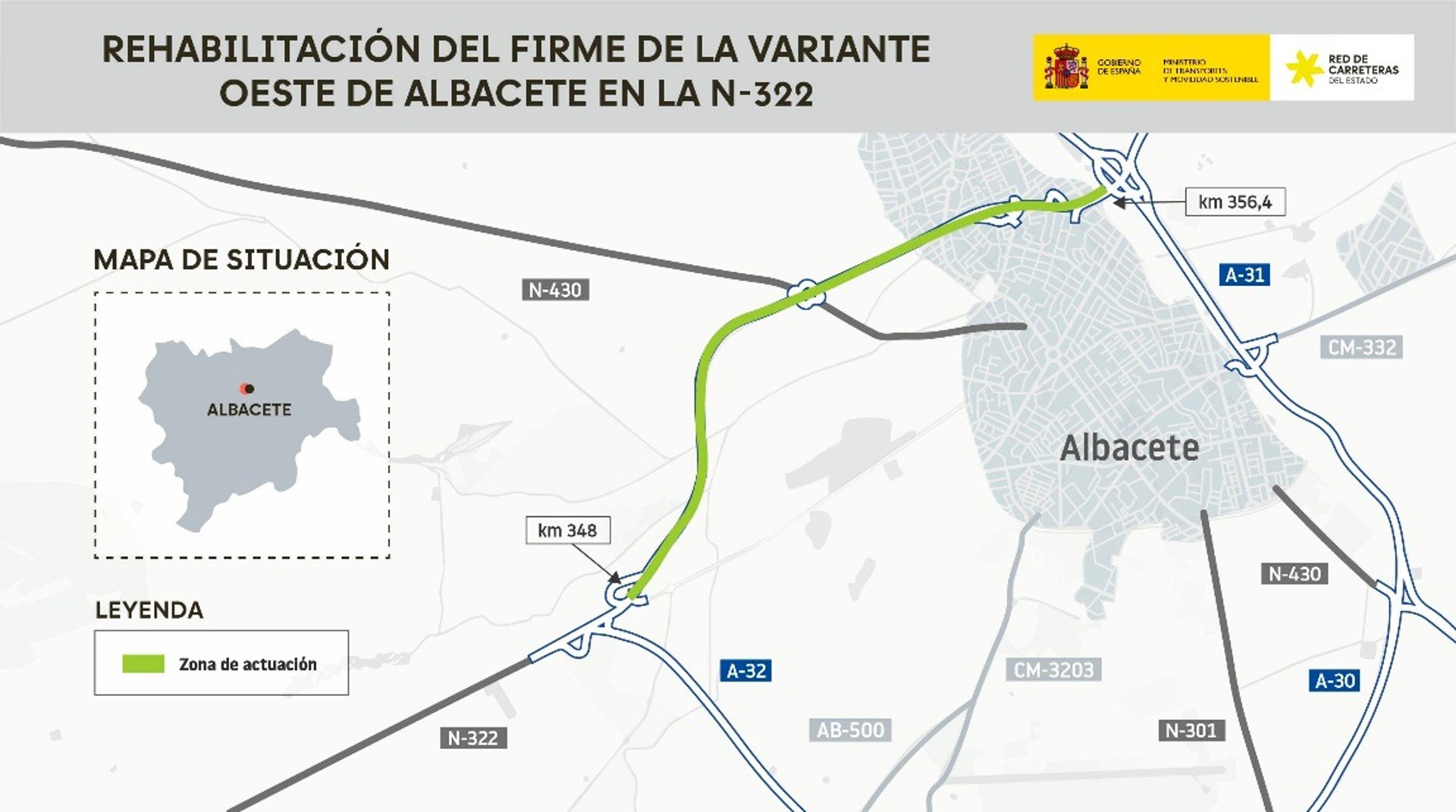 El Ministerio de Transportes y Movilidad Sostenible ha licitado la rehabilitación superficial del firme de la carretera N-322 en el tramo comprendido entre los kilómetros 348 y 356,4 correspondientes a la Variante Oeste de Albacete, una inversión de 4.648.078 euros IVA incluido que persigue mejorar la seguridad vial y prolongar la vida útil de la infraestructura.