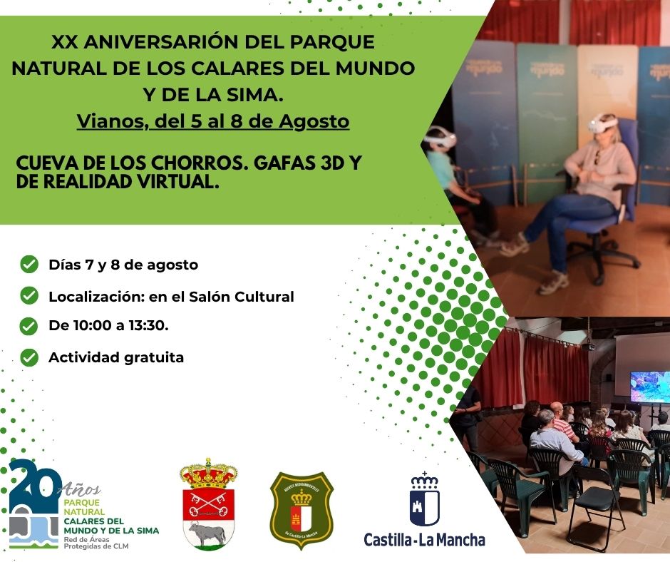 El Salón Cultural de Vianos acogerá durante dos jornadas una innovadora actividad que permitirá a los asistentes recorrer virtualmente la Cueva de los Chorros a través de gafas de realidad virtual y 3D. Una inmersión visual para descubrir las entrañas del parque sin salir del municipio.