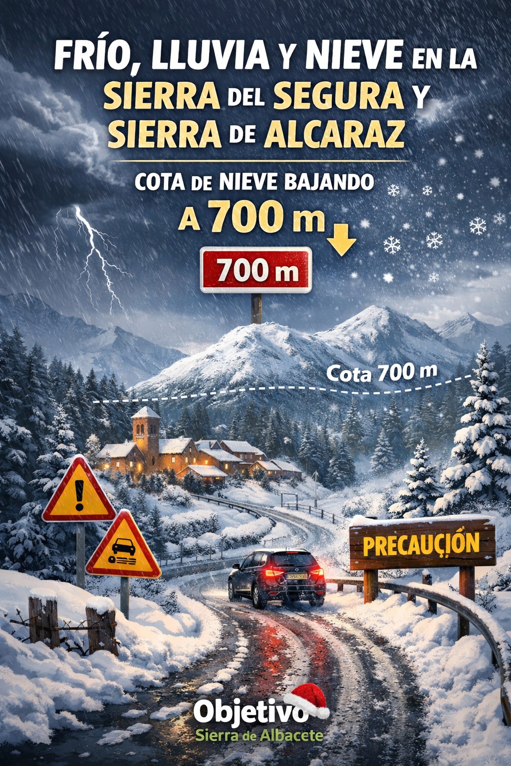 Uno de los elementos más significativos de este episodio será la evolución de la cota de nieve, que comenzará en niveles relativamente altos y descenderá de forma notable, pudiendo situarse en torno a los 700 metros en algunos momentos. Este descenso aumenta la probabilidad de nevadas en amplias zonas de la Sierra del Segura y la Sierra de Alcaraz, especialmente en áreas de mayor altitud y en el interior del territorio.